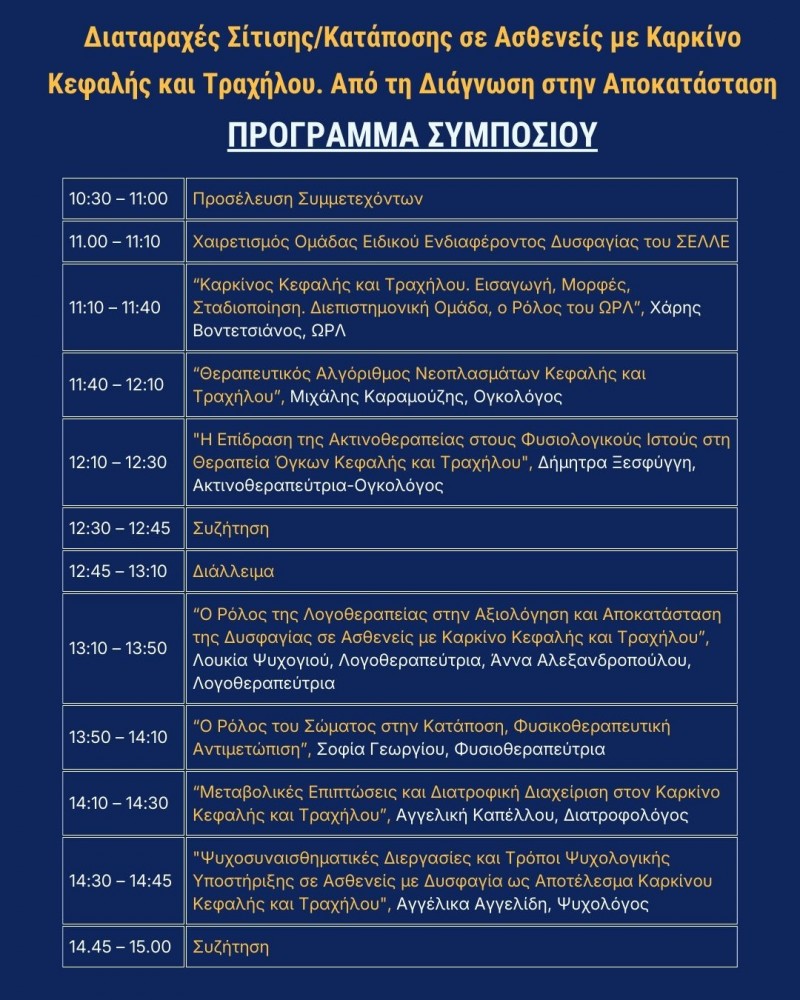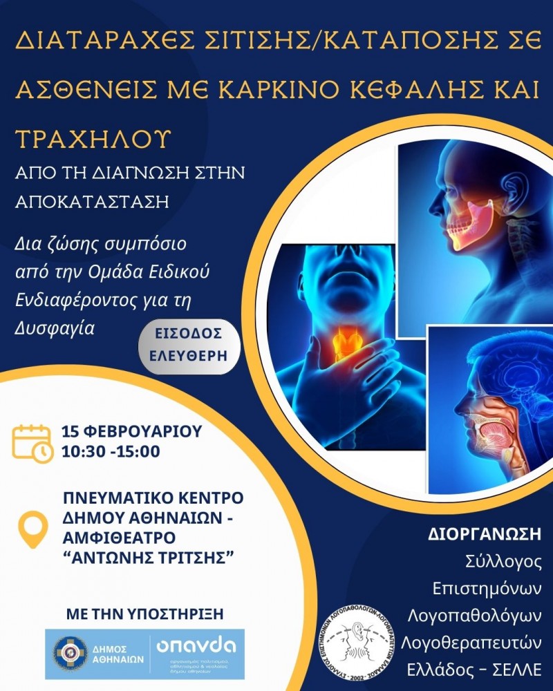Η Ομάδα Ειδικού Ενδιαφέροντος του ΣΕΛΛΕ για τη Δυσφαγία διοργανώνει Δια ζώσης Συμπόσιο με θέμα "Διαταραχές Σίτισης/Κατάποσης σε Ασθενείς με Καρκίνο Κεφαλής και Τραχήλου. Από τη Διάγνωση στην Αποκατάσταση". Το συμπόσιο θα πραγματοποιηθεί 15 Φεβρουαρίου 2026 στο Πνευματικό Κέντρο Δήμου Αθηναίων - Αμφιθέατρο "Αντώνης Τρίτσης",  Ακαδημίας 50 στην Αθήνα. (άμεση πρόσβαση από τη στάση ΜΕΤΡΟ "ΠΑΝΕΠΙΣΤΗΜΙΟ". Κεντρική είσοδο από οδό Ακαδημίας. Είσοδο για Α.με.Α από την οδό Σόλωνος).
