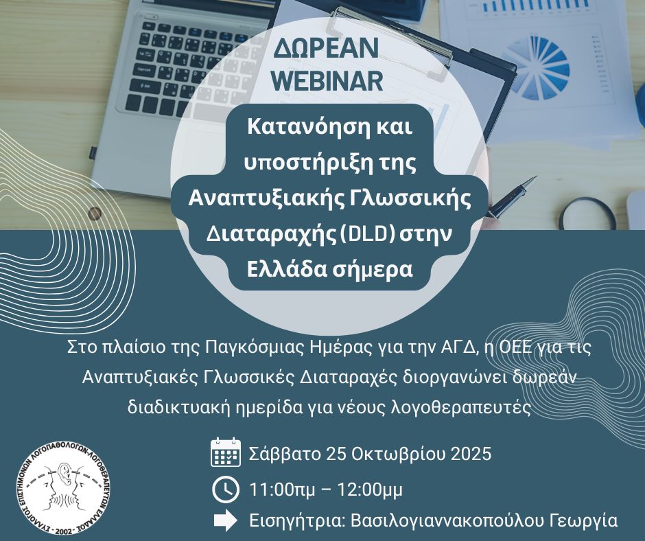 Στο πλαίσιο της Παγκόσμιας Ημέρας για την ΑΓΔ, η Ομάδα Ειδικού Ενδιαφέροντος για τις Αναπτυξιακές Γλωσσικές Διαταραχές διοργανώνει διαδικτυακή ημερίδα για νέους λογοθεραπευτές, με τίτλο: "Κατανόηση και υποστήριξη της Αναπτυξιακής Γλωσσικής Διαταραχής (DLD) στην Ελλάδα σήμερα". Η ημερίδα θα διεξαχθεί διαδικτυακά από την κυρία Βασιλογιαννακοπούλου Γεωργία, το Σάββατο 25 Οκτωβρίου στις 11.00πμ, μέσω zoom και θα διαρκέσει μία ώρα.